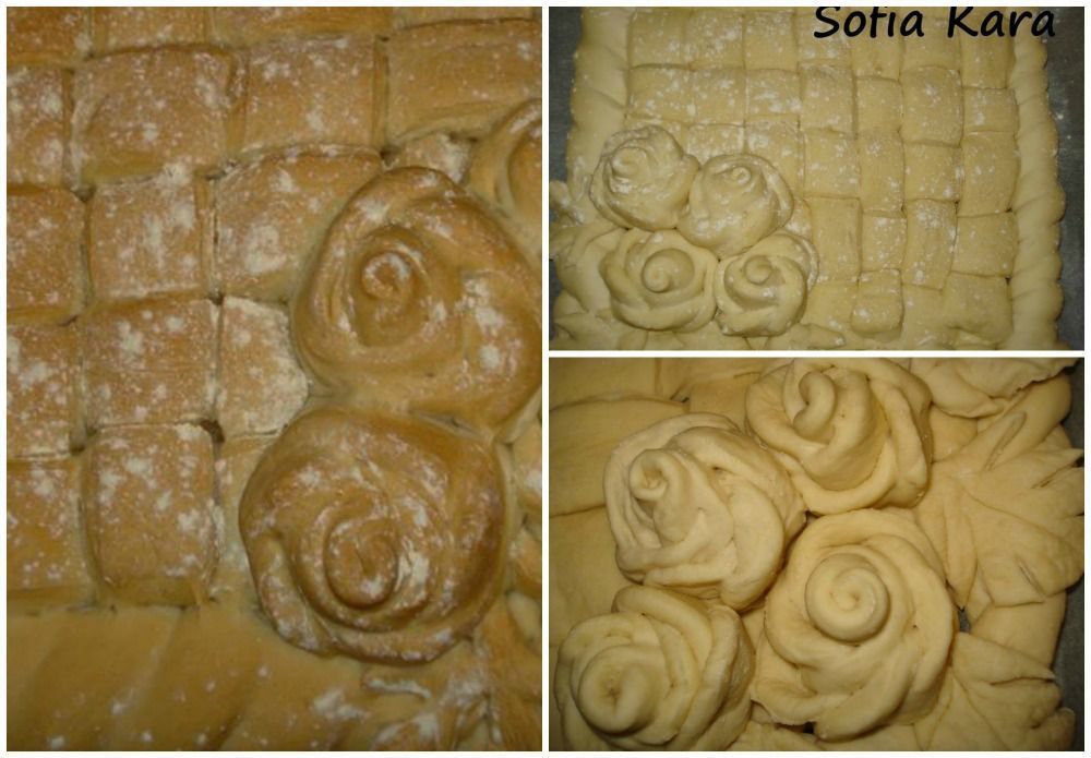 Αφου διπλασιαστει αρχιζω να δημιουργω !Ανοιγω 2 φυλλα και κοβω 7 λωριδες απο το ενα και 7 απο το αλλο !Βαζω τις 7 στο ταψι με τη λαδοκολλα,σηκωνω τις 4 βαζω αλλη λωριδα κατεβαζω τις4 και σηκωνω τις 3 βαζω αλλη κοκ!Αφου τελειωσω το πλεξιμο κανω τα τριανταφυλλακια και τα φυλλαρακια !Ανοιγουμε ενα στρογγυλο φυλλο με τη ζυμη και δημιουργουμε κυκλακια με κουπ πατ!