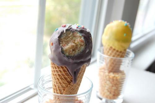 Όχι δεν είναι παγωτίνια, είναι Cake Ball Scones. Χωνάκια με κέηκ δηλαδή. Πάρτε την γνωστή συνταγή για cake pops : ένα κέηκ το οποίο το θρυμματίζουμε και το ενώνουμε με μισή συσκευασία έτοιμο γλάσο (υπάρχει στα μεγάλα supermarket) ή ένα φακελάκι «δικό μας» γλάσο κουβερτούρας Γιώτης, ενώνουμε, πλάθουμε σε μπαλάκια και τοποθετούμε πάνω σε χωνάκια παγωτού. βουτάμε σε κουβερτούρα λευκή ή κλασική και στολίζουμε. Απίθανα!