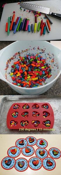Για να ξεφύγουμε απο τα φαγώσιμα μια πολύ όμορφη και πρακτική ιδέα είναι οι χρωματιστές κηρομπογιές που έχουμε ξαναδεί και στο eimaimama. Πάρτε ότι ξεχασμένη, χαλασμένη ή καινούργια κηρομπογιά έχετε σπίτι, κόψτε την σε κομματάκια, γεμίστε ανακατεύοντας τα χρώματα φόρμες σιλικόνης, ψήστε στους 230 για 15′. Αφαιρέστε και έχετε πολύχρωμες κηρομπογιές σε ότι σχήμα φανταστείτε.