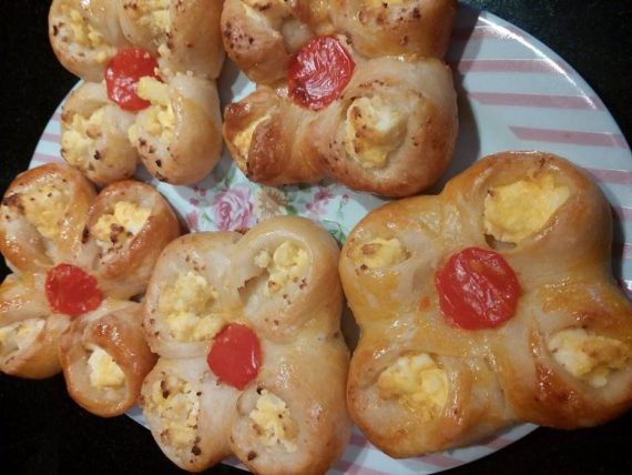 Σε μια μεγαλη λεκανη βαζω τα 2 φακελακια μαγια ,το γαλα και τη ζαχαρη!Ανακατευω μεχρι να λιωσουν! Προσθετω το λαδι και τα ασπραδια και συνεχιζω το ανακατεμα! Προσθετω σιγα σιγα το αλευρι με το αλατι και αρχιζω να ζυμωνω μεχρι να πετυχω μια ευπλαστη ζυμη που δεν κολλαει στα χερια! Αφηνω τη ζυμη να διπλασιαστει! Αφου διπλασιαστει ,χωριζω τη ζυμη σε μπαλακια μεγεθος μανταρινιου! Παιρνω ενα μπαλακι το ανοιγω με το ρολακι μου το κοβω χιαστη οχι τελειως οπως στη φωτο ,και βαζω απο μια κουταλια ανθοτυρο! Κλεινω ενα ,ενα το ζυμαρακι με το μειγμα και δημιουργω το λουλουδακι ! Κοβω με ενα πολυ μικρο κουπ πατ την πιπερια και την τοποθρτω στη μεση του λουλουδιου! Τοποθετω τα λουλουδακια στο ταψι με τη λαδοκολλα , αλειφω με αυγο και τα αφηνω να διπλασιαστουν! Ψηνω στους 180 β για 30 λ! Ειναι ετοιμα για να τα απολαυσω!ΜΜΜΜΜΜΜΜΜΜΜΜ Τελεια!!!!!!!