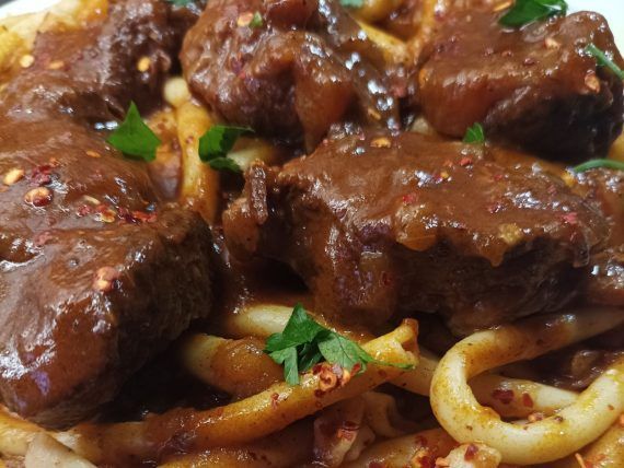 Δείτε παρακάτω την εκτέλεση για την κερκυραϊκή παστιτσάδα με χοντρό μακαρόνι και μοσχάρι: