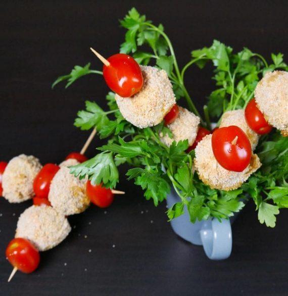 Βουτάμε τα μπαλάκια σε ασπράδι αυγού και τριμμένη φρυγανιά. Τα βάζουμε σε ταψί με αντικολλητικό χαρτί και τα ψήνουμε στους 170 βαθμούς μέχρι να ροδίσουν. Μπορούμε να τα σερβίρουμε σε ξυλάκια από σουβλάκια μαζί με ντοματίνια.