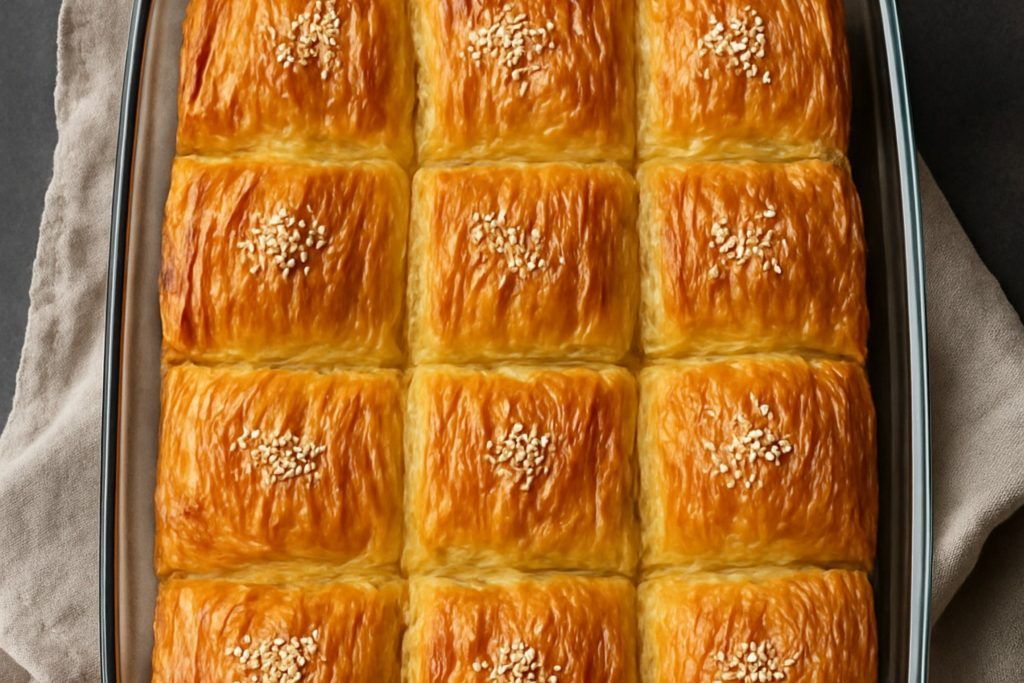 Τα υπόλοιπα φύλλα τα τσαλακώνουμε σε λωρίδες και τα τοποθετούμε στην επιφάνεια το ένα δίπλα στο άλλο. Αλείφουμε τα φύλλα με βούτυρο. Βάζουμε στο ψυγείο για 20 λεπτά να παγώσει το βούτυρο. Κόβουμε σε κομμάτια, αλείφουμε με λίγο ακόμα βούτυρο, ψεκάζουμε με νερό και πασπαλίζουμε με σουσάμι. Ψήνουμε στους 160°C αντιστάσεις, χαμηλά στο φούρνο, για 60-70 λεπτά μέχρι να ροδίσει. Σας άρεσε αυτή η συνταγή; Πείτε μας την γνώμη σας στα σχόλια.
