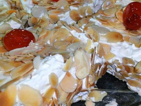 Παίρνουμε κάθε πάστα παγωμένη και την αλείφουμε γύρω γύρω με την σαντιγί. Έπειτα πασπαλίζουμε με φιλέ αμυγδάλου το οποίο το έχουμε ψήσει για 15 λεπτά και διακοσμούμε με κερασάκια.