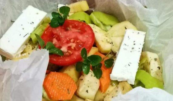 Στην αρχή κόβουμε τις μελιτζάνες σε ροδέλες, το κολοκυθάκι κομμένο σε ροδέλες, την πιπεριά κομμένη σε ροδέλες, το καρότο κομμένο σε ροδέλες και τα βάζουμε σε ένα σκεύος με λαδόκολλα. Προσθέτουμε επίσης το σκόρδο, την φέτα ντομάτας, την κατσικίσια φέτα και την ρίγανη.