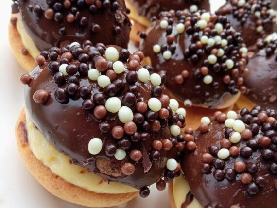 Βγάζουμε την κρέμα από το ψυγείο και την χτυπάμε στο μίξερ μέχρι να αφρατέψει. Στο τέλος κολλάμε τις βάσεις ανά δυο με την κρέμα και έπειτα τα καπάκια τους στο γλάσο, το οποίο το φτιάξαμε λιώνοντας την σοκολάτα σε μπεν μαρί. Διακοσμούμε με σοκολατάκια αν θέλουμε.