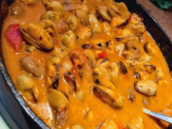 Εκτέλεση για τα κοκκινιστά μύδια σαγανάκι με μανιτάρια