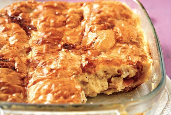 250 γρ. κασέρι 250 γρ. γραβιέρα 250 γρ. έμενταλ 250 γρ. κεφαλογραβιέρα 250 γρ. φέτα 250 γρ. ζαμπόν 1 πακέτο (450 γρ.) φύλλο κρούστας 1 λίτρο φρέσκο γάλα 5 μεγάλα αυγά Φρεσκοτριμμένο πιπέρι 3 κ.σ. βούτυρο λιωμένο
