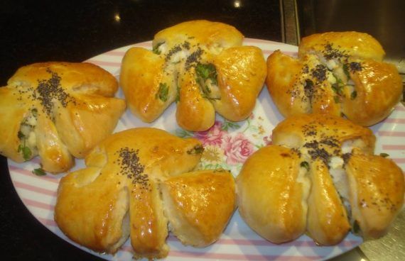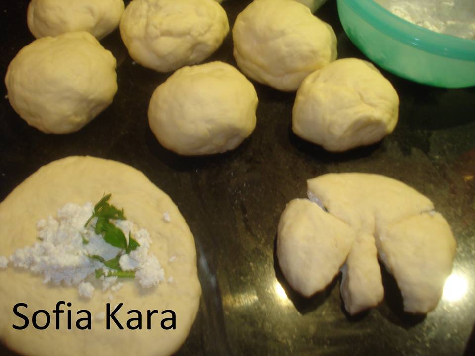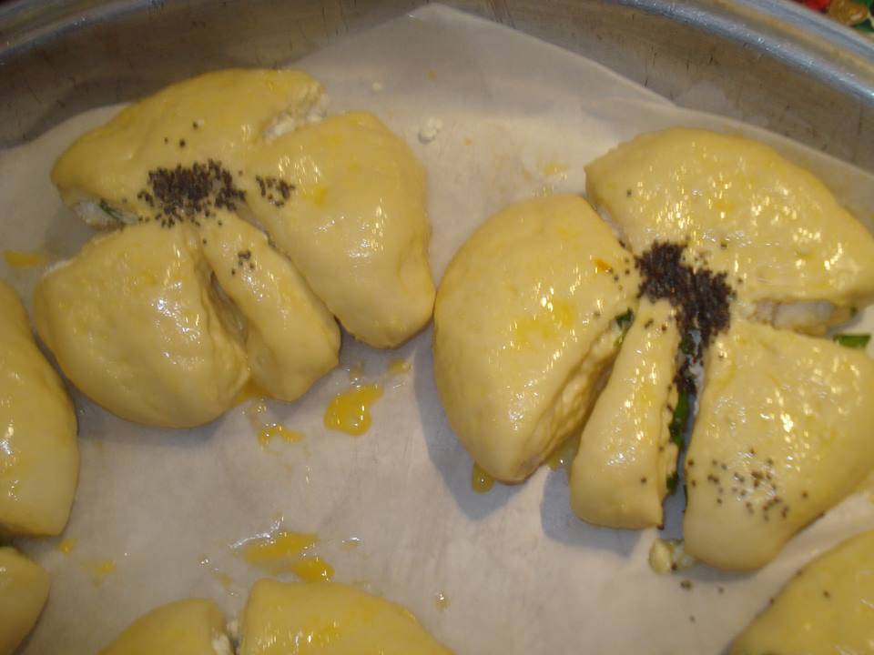 ΥΛΙΚΑ 1 φλυτζανι λαδι 1 φλυτζανι γιαουρτι 1 φλυτζανι γαλα 1 φακ ξηρη μαγια 1 κουταλι της σουπας ζαχαρη 1 κουταλακι του γλυκου αλατι 2 αυγα ,το 1 για αλειμμα παπαρουνοσπορο αλευρι οσο σηκωσει .Περιπου 5 με 6 φλυτζανια ΓΕΜΙΣΗ Φετα ,ανθοτυρο και μαιντανο ΕΚΤΕΛΕΣΗ Σε μια λεκανη ριχνω τη μαγια ,τη ζαχαρη ,το γαλα ,λιγο αλευρι και ανακατευω! Προσθετω το γιαουρτι ,το αυγο και συνεχιζω το ανακατεμα ! Σιγα σιγα ριχνω το αλευρι με το αλατι και ζημωνω μεχρι να γινει μια ευπλαστη ζυμη! Αφηνω το ζυμαρι μου να διπλασιαστει! Αφου διπλασιαστει κανω 16 μικρα μπαλακια σαν μανταρινια! Ανοιγω με το χερι μου ενα μπαλακι !, Βαζω ενα κουταλακι μειγμα απο ανθοτυρο ,φετα και μαιντανο στο κεντρο της ζυμης ! Κλεινω τη ζυμη και το ανοιγμα το βαζω απο κατω! Το παταω με το χερι μου ,κοβω με τον κοφτη μου και κανω ενα το τριφυλλακι! Αλειφω τα τριφυλλακια με αυγο ,στολιζω στη μεση με παπαρουνοσπορο και τα αφηνω παλι να διπλασιαστουν! Ψηνω στους 180 β για 25 με 30 λ!