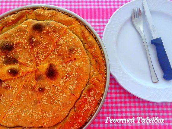 4) Ανοίγετε μέ τόν πλάστη 4 φύλλα. Αλείφετε ένα ταψί Νο 32 μέ λάδι, στρώνετε ένα φύλλο, τό αλείφετε μέ λίγο λάδι καί βάζετε άλλο ένα φύλλο. Ρίχνετε τή γέμιση καί τήν απλώνετε. Στρώνετε τά υπόλοιπα φύλλα, αλείφοντάς τα μέ λάδι. Χαράζετε τήν πίτα σέ κομμάτια καί αλείφετε τήν επιφάνεια μέ αυγό χτυπημένο μέ λίγο νερό καί λίγο λάδι.