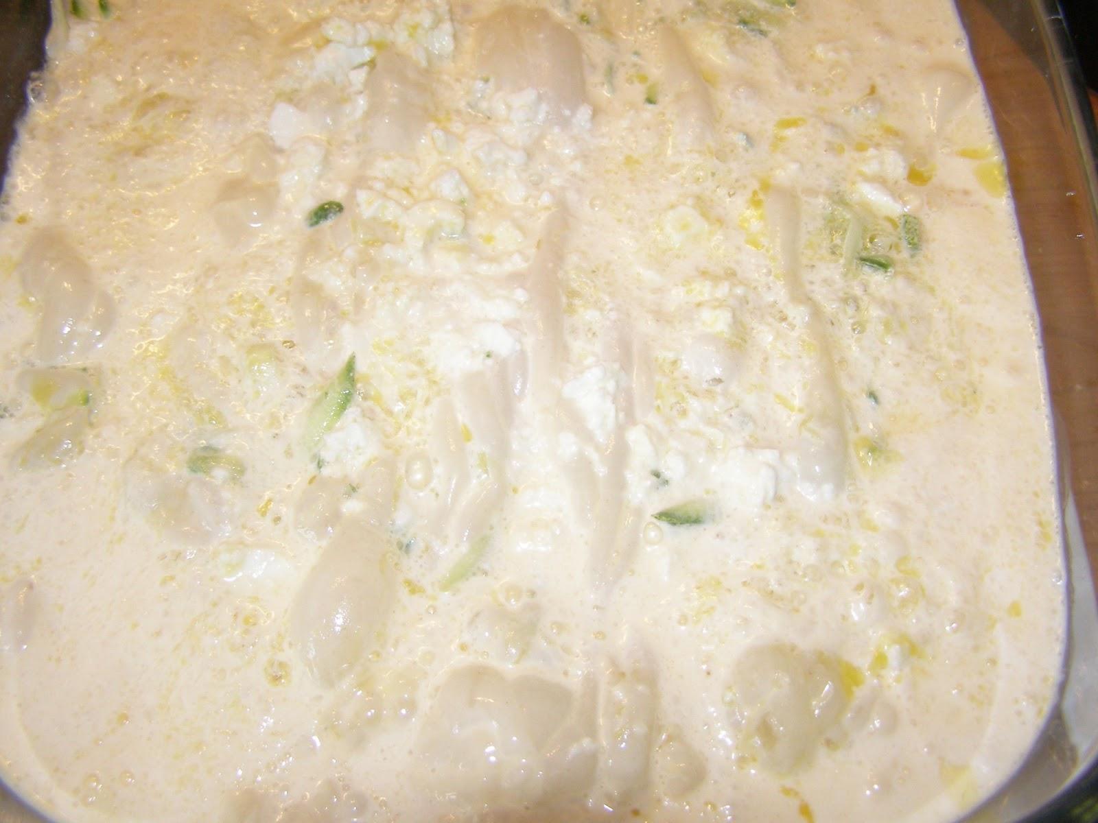 Τρίβουμε το κολοκύθι και το αφήνουμε σε σουρωτήρι να φύγουν τα υγρά του. Στρώνουμε ένα φύλλο στον πάγκο και το ραντίζουμε με το τριμμένο κολοκύθι και τη φέτα. Το κάνουμε πλισέ και το βάζουμε σε πυρίμαχο σκεύος. Συνεχίζουμε το ίδιο και με τα υπόλοιπα φύλλα. Ρίχνουμε το βούτυρο να πάει παντού. Χτυπάμε ελαφρά τα αυγά, προσθέτουμε την κρέμα γάλακτος και τα ρίχνουμε και αυτά πάνω από τα φύλλα. Τέλος περιχύνουμε παντού και τη σόδα. Αφήνουμε να σταθεί περίπου 30 λεπτά και ψήνουμε σε μέτριο φούρνο (αέρα) για περίπου 40 λεπτά.