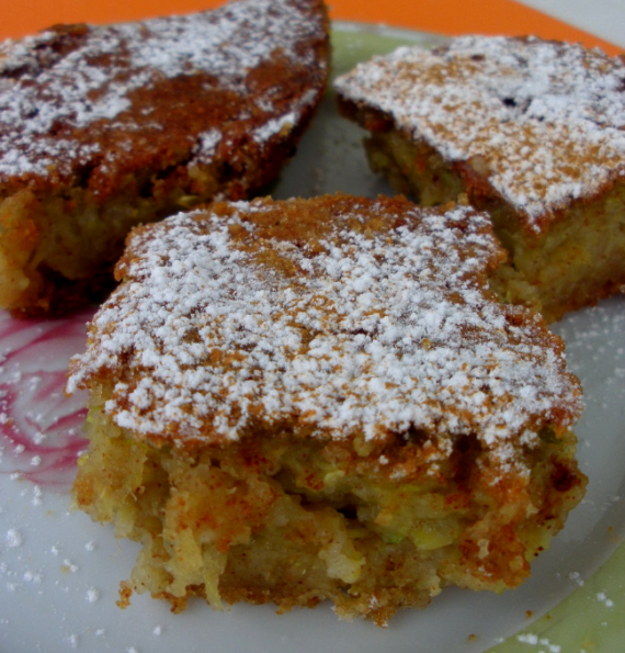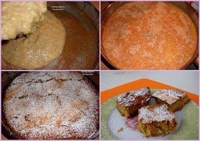 1 κιλό κολοκυθάκια, καθαρισμένα και τριμμένα στον τρίφτη 4-5 αβγά 2 φλ. του ελληνικού καφέ φαρίνα που φουσκώνει μόνη της 2 φλ. του ελλην. καφέ σιμιγδάλι ψιλό ή χοντρό 5 φλ. του ελλην. καφέ ζάχαρη κρυσταλλική 2 φλ. του ελλην. καφέ γάλα 1 κ.γλ. μπέικιν 2 κ.γλ. κανέλα 1 φλ. του ελλην. καφέ ελαιόλαδο ελαφρύ ή σπορέλαιο για το ταψί Άχνη για το πασπάλισμα Φρυγανιά τριμμένη για πασπάλισμα