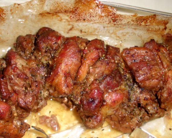 Σε ένα μεγάλο μπολ αναμιγνύουμε όλα τα υλικά της μαρινάδας. Βάζουμε τα κομμάτια του κρέατος μέσα και το αφήνουμε για όλη τη νύχτα. Την επομένη, προθερμαίνουμε το φούρνο στους 180 βαθμούς Κελσίου. Βγάζουμε το κρέας από τη μαρινάδα, βάζουμε το ένα κομμάτι “κολλητά” στο άλλο (ή το περνούμε σε ξυλάκια για σουβλάκια), το τυλίγουμε σε λαδόκολλα και το βάζουμε σε ένα ταψί να ψηθεί, για 1 1/2 ώρα περίπου (προσοχή: αυτό εξαρτάται και από την ποιότητα του κρέατος). Το σερβίρουμε με τη λαδόκολλα μέσα σε πιατέλα κι αν θέλουμε το συνοδεύουμε με τηγανιτές πατάτες φούρνου ή ρύζι.