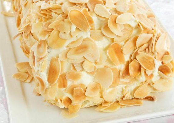 Σε ένα μπολ χτυπάμε τα ασπράδια από τα 6 αυγά με το μίξερ και προσθέτουμε την ζάχαρη σιγά σιγά. Μόλις γίνει μια σφικτή μαρέγκα προσθέτουμε και τους κρόκους έναν – έναν. Προσθέτουμε το αλεύρι και το κακάο και ανακατεύουμε στην χαμηλή ταχύτητα του μίξερ. Ρίχνουμε το μείγμα μας σε ένα ταψί που έχουμε βάλει αντικολλητικό χαρτί και το ψήνουμε στους 180 βαθμούς για 10-15 λεπτά. Μόλις είναι έτοιμο το βγάζουμε και το αφήνουμε να κρυώσει. Σε μια κατσαρόλα ζεσταίνουμε το 1 λίτρο γάλα και 100 γρ από την ζάχαρη. Σε ένα μπολ ανακατεύουμε τους 8 κρόκους με τα υπόλοιπα 100 γρ ζάχαρης , το κορν φλάουερ και τους αραιώνουμε με λίγο γάλα.Το μείγμα αυτό το προσθέτουμε στην κατσαρόλα με το γάλα που ζεσταίνουμε και ανακατεύουμε, σε χαμηλή θερμοκρασία για 10 λεπτά. Αποσύρουμε την κατσαρόλα από την φωτιά και προσθέτουμε το βούτυρο ανακατεύοντας να λιώσει. Αφήνουμε το μείγμα να κρυώσει. Αλείφουμε το περισσότερο μέρος από το παντεσπάνι με την κρέμα που φτιάξαμε και προσθέτουμε τα αμύγδαλα, το γλυκό του κουταλιού (χωρίς σιρόπι , το στραγγίζουμε καλά) και τυλίγουμε προσεκτικά σε ρολό. Αλείφουμε με την υπόλοιπη κρέμα το παντεσπάνι και το τοποθετούμε σε μια πιατέλα. Διακοσμούμε με αμύγδαλα φιλέ.