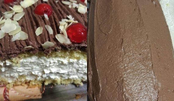 Χτυπάμε την κρέμα ζαχαροπλαστικής μαζί με το γάλα μέχρι να πήξει. Στην συνέχεια χτυπάμε την κρέμα ζαχαροπλαστικής σοκολάτα μαζί με το γάλα μέχρι να πήξει. Όταν ψηθεί το παντεσπάνι μας το ρολάρουμε, το βάζουμε στην άκρη και όταν κρυώσει καλά, το ανοίγουμε και σιροπιάζουμε λίγο.
