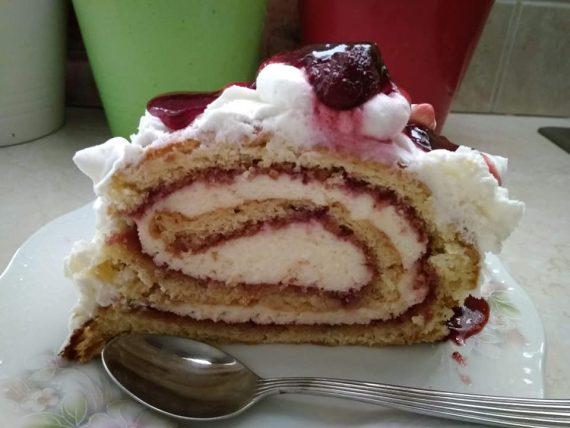 Αφού ψηθεί το παντεσπάνι μας το αναποδογυρίζουμε πάνω σε μια νωπή πετσέτα το σκεπάζουμε και το αφήνουμε να κρυώσει. Όταν κρυώσει απλώνουμε από πάνω μια στρώση μαρμελάδα (εγώ έβαλα φράουλα). Πάνω από την μαρμελάδα ρίχνουμε την κρεμά μπαβαρουάζ, (εγώ λόγω βιασύνης έβαλα την έτοιμη).
