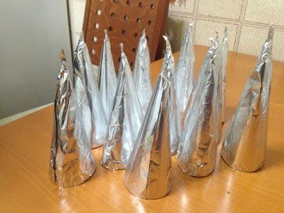 Αν δεν έχουμε τα ειδικά χωνάκια φτιάχνουμε με χαρτόνι, συρραπτικό και αλουμινόχαρτο.