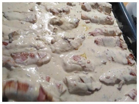 Η σάλτσα αλά κρεμ είναι ακόμη πιο εύκολη με απλά και λαχταριστά υλικά. Στο τέλος θα ψήσουμε τα κοτομπέικον και την σάλτσα στον φούρνο. Είναι ένα υπέροχο φαγητό για το Κυριακάτικο τραπέζι και όχι μόνο! Υπέροχη ιδέα και για τον μπουφέ ή για το επίσημο τραπέζι.