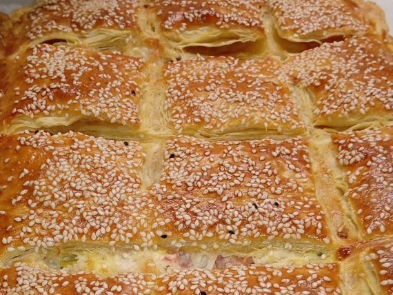 Λαδώνουμε την πίτα και την πασπαλίζουμε με σουσάμι. Χαράζουμε λίγο και ψήνουμε στους 200 βαθμούς Κελσίου, για 30 λεπτά, ανάλογα και τον φούρνο, αντιστάσεις, πάνω κάτω.