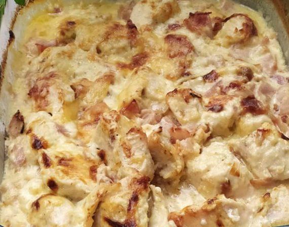 Στην αρχή κόβουμε το κοτόπουλο σε μπουκιές. Βράζουμε το κοτόπουλο σε αλατισμένο νερό για 10 λεπτά. Αφού βράσει το στραγγίζουμε και το τοποθετούμε σε ένα ταψί. Στο μεταξύ σε ένα τηγάνι τσιγαρίζουμε το μπέικον και τα κρεμμύδια ψιλοκομμένα. Αφού τσιγαριστούν τα ρίχνουμε και αυτά στο ταψί με το κοτόπουλο.