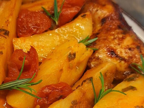 Πατάτες με κοτόπουλο στο φούρνο, αλλά αντί για λεμονάτα, γιαχνί. Δηλαδή κοκκινιστά με φρέσκια ντομάτα! Δοκιμάστε το και θα μας θυμηθείτε.