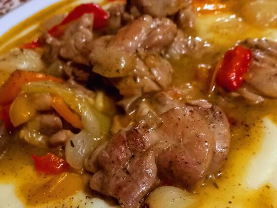 Εκτέλεση για το ζουμερό κοτόπουλο με χρωματιστές πιπεριές και πουρέ