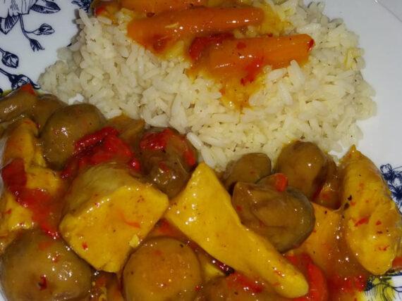Συνταγή για πικάντικο κοτόπουλο με ρύζι με μελωμένη σάλτσα από κάρυ, μανιτάρια και διάφορα λαχανικά για το μεσημεριάνο όλης της οικογένειας.
