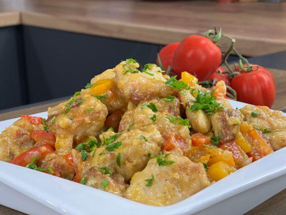 700 g Chicken breast Salt Pepper 6 tbsp plain flour 80 g vegetable oil ————————————- 1 orange pepper 1 red pepper 2 garlic cloves 1 medium onion 1 tbsp plain flour 200 g vegetable broth 1 tbsp mustard Parsley