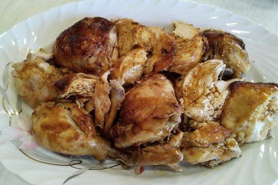 Στην μία ώρα ψησίματος, γυρίζουμε το κοτόπουλο από την άλλη πλευρά. Λίγο πριν το τέλος βγάζουμε το καπάκι της γάστρας να πάρει χρώμα. Όταν είναι έτοιμο αφαιρούμε το κοτόπουλο από την γάστρα και περνάμε την σάλτσα από την σίτα. Δένουμε την σάλτσα, με λίγο διαλυμένο κορν φλάουρ.