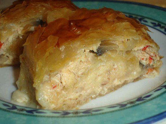 Προσθέτουμε την πιπεριά ψιλοκομμένη και τέλος το κοτόπουλο. Ρίχνουμε αλάτι και πιπέρι και αποσύρουμε από τη φωτιά. Κατόπιν ρίχνουμε μέσα 2 φλυτζάνια του τσαγιού διάφορα κασέρια τριμμένα καθώς επίσης και το συμπυκνωμένο γάλα. Η γέμισή μας είναι έτοιμη. Παίρνουμε 5 φύλλα και τα βουτυρώνουμε ένα – ένα. Απλώνουμε τη γέμιση στο μισό των φύλλων, αφού την έχουμε πρώτα χωρίσει σε τρία ίσα μέρη, τυλίγουμε σφιχτά σε ρολό και τοποθετούμε σε ταψί. Το ίδιο κάνουμε και για τα υπόλοιπα φύλλα.