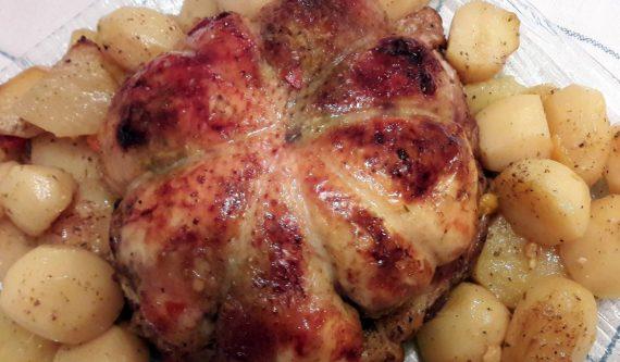 Βάζουμε το κοτόπουλο σε μια γάστρα Σε μια λεκάνη βάζουμε καθαρισμένες και πλυμένες τις πατάτες . προσθέτουμε όλα τα υλικά μαζί. Το μέλι το βάζουμε στον φούρνο μικροκυμάτων για λίγα δευτερόλεπτα να γίνει σαν νερό και το προσθέτουμε και αυτό στην λεκάνη. Ανακατεύουμε καλά. Βάζουμε τις πατάτες στην γάστρα και περιχύνουμε με όλα τα υλικά που έμειναν στην λεκάνη. ψήνουμε στους 200 μέχρι να φύγουν όλα τα υγρά από την γάστρα γυρίζοντας το κοτόπουλο στην μέση του χρόνου ψησίματος να ροδίσει και από τις δυο πλευρές.