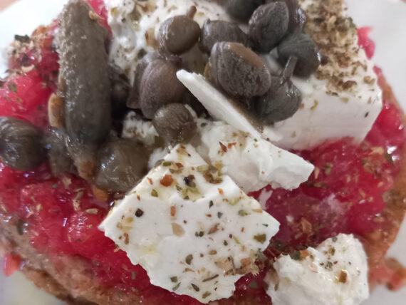 Συνταγή για κουκουβάγια ή αλλιώς ντάκο με τριμμένη ντομάτα, φέτα, κάπαρη, ελαιόλαδο και ρίγανη, για ορεκτικό στα κρεατικά, στα ψάρια και στα θαλασσινά αλλά και για χορταστικό βραδινό με μεσογειακά αρώματα και χρώματα. Από τη φίλη μας Δέσποινα Πολυκρέτη.