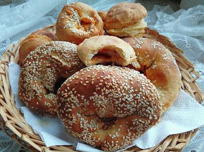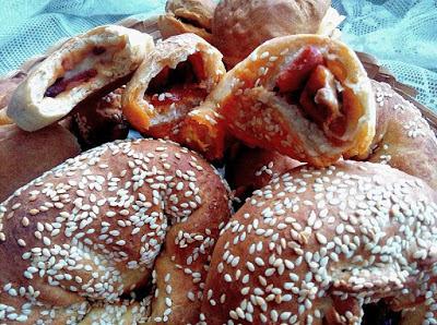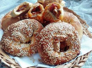 Ανοίγουμε με πλαστή την ζύμη κόβουμε σε μακρόστενα κομμάτια βάζουμε γέμιση και κλείνουμε τις άκρες τα περνάμε από το σουσάμι ενώνουμε τις δύο άκρες και δίνουμε σχήμα κουλούρας… Για τα πιτσακια κόβουμε με κουπ-ατ στρογγυλα γεμίζουμε στη μέση και κλείνουμε πάλι επάνω με άλλο ένα κομμάτι ζύμης ψήνουμε στους 200 βαθμούς για 25 30 λεπτά περίπου…πάντα ανάλογα τον φούρνο μας…Καλή επιτυχία !!!