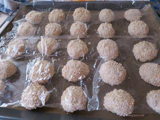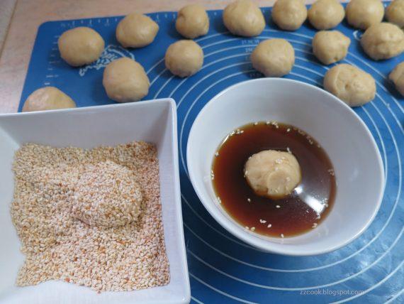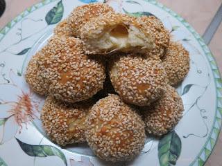 Κάνουμε μπαλίτσες όσο ένα καρύδι τις πατάμε λίγο με το δάχτυλο και κρύβουμε ένα κυβάκι κασέρι ή τυρί φέτα, τα κλίνουμε και τα βουτάμε πρώτα στο σιρόπι και μετά στο σουσάμι.