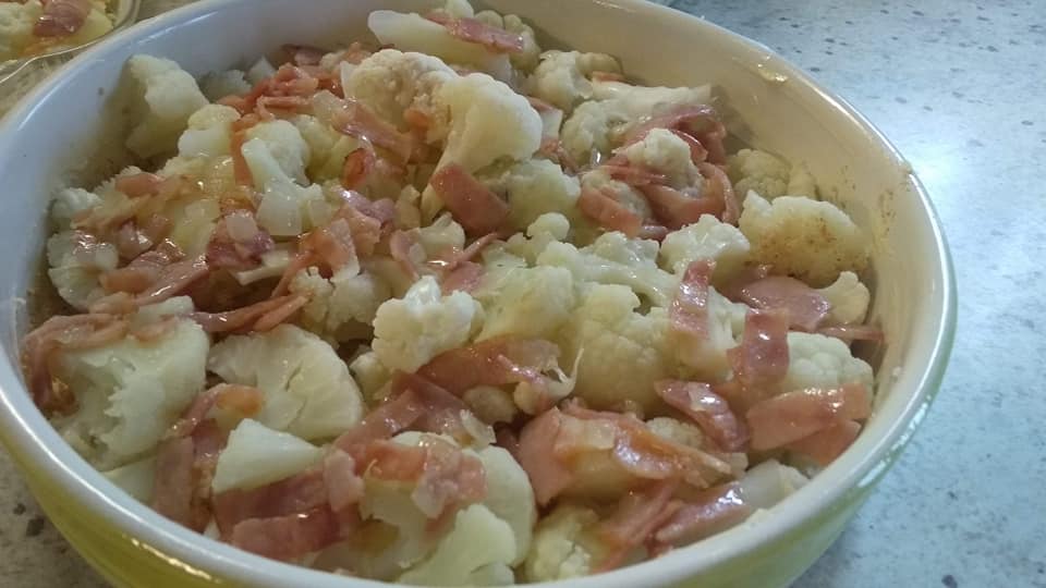 Πλένω και χωρίζω το κουνουπίδι σε τουφιτσες. Σε βραστό νερό το ζεματάω για 4 λεπτάκια. Στραγγίζω καλά. Βουτυρώνω ένα πυρέξ και πασπαλίζω με λίγη φρυγανιά. Βάζω το κουνουπίδι μου. Σοτάρω το ψιλοκομμένο κρεμμύδι με λίγο λαδάκι και το μπέικον μαζί. Ρίχνω πάνω από το κουνουπίδι διάσπαρτα. Αν θέλω πασπαλίζω με λίγο ακόμα τυράκι. Ετοιμάζω τη μπεσαμέλ.
