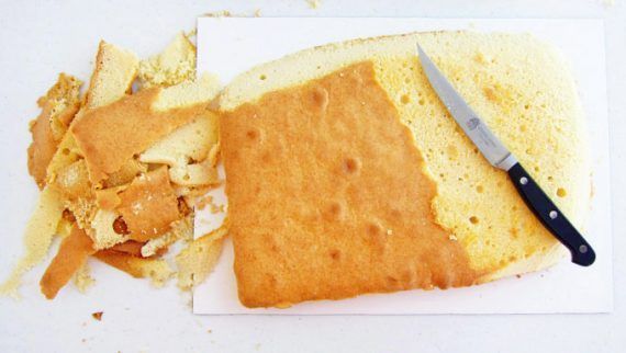 Στη συνέχεια, σκάψτε το τετράγωνο σας κέικ προκειμένου να του βάλετε πάνω τη σαντιγύ και να σχηματίσετε το σώμα του.