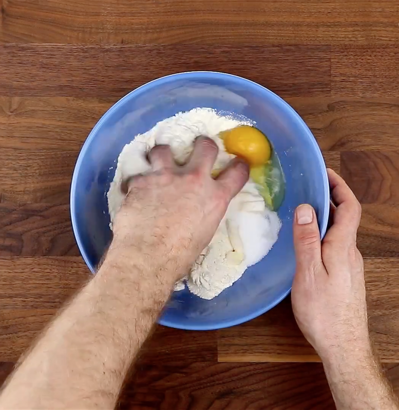 - Τοποθετήστε το αλεύρι, το βούτυρο,τη ζάχαρη, το αλάτι, και το αυγό σε ένα μπολ και ζυμώστε μαζί για να σχηματιστεί μια ζύμη.