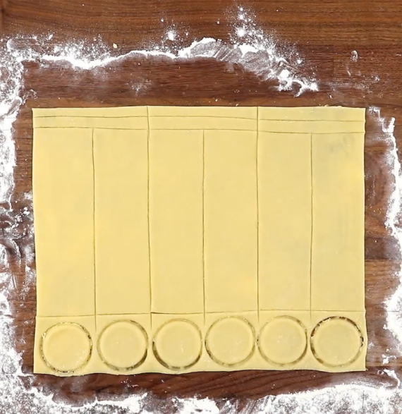 - Πασπαλίστε μια επιφάνεια εργασίας με αλεύρι, ανοίξτε τη ζύμη και κόψτε έξι μικρούς κύκλους στο κάτω μέρος. Κόψτε το υπόλοιπο της ζύμης σε έξι λωρίδες με πάχος, και στη συνέχεια σε έξι μικρές, λεπτές λωρίδες (Βλέπε την εικόνα παρακάτω).