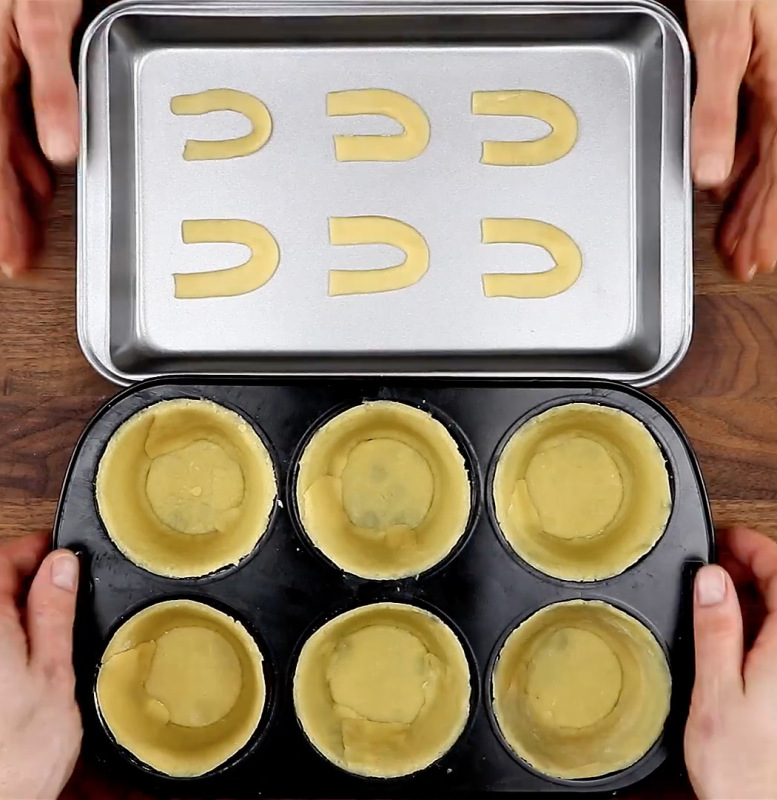 - Τοποθετήστε τους κύκλους στο κάτω μέρος ενός ταψιού για muffin , και τις χοντρές λωρίδες γύρω από τις άκρες. Πάρτε τις μικρότερες λωρίδες και βάλτε τες ξεχωριστά σε ένα ταψί κάνοντας τους ένα σχήμα U. Ψήστε τα για 20 λεπτά στους 170 ° Κελσίου.