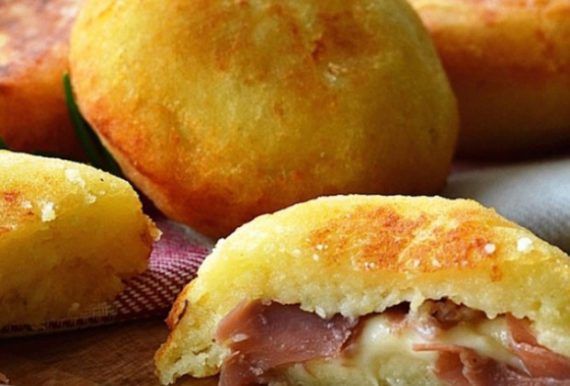 Όταν η ζύμη είναι μαλακιά και ελαστική, φτιάχνουμε μπάλες και τις γεμίζουμε μέσα με το τυρί και το ζαμπόν, κλείνοντας καλά τα άκρα τους για να μη φύγει η γέμιση.Βάζουμε σε ένα τηγάνι λάδι και όταν ζεσταθεί, τηγανίζουμε τις μπάλες πατάτας. Αν θέλετε να αποφύγετε το τηγάνισμα, μπορείτε να τα βάλετε στο φούρνο προθερμασμένο στους 200 βαθμούς για περίπου 12-15 λεπτά.
