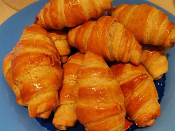Με το δάχτυλό μας βάζουμε νερό στις άκρες κάθε τρίγωνου και ρολάρουμε σε κρουασάν. Αλείφουμε με το χτυπημένο αυγό. Ψήνουμε σε ένα ταψί με λαδόκολλα, σε προθερμασμένο φούρνο, στον αέρα, στους 180 βαθμούς Κελσίου για περίπου 40-45 λεπτά.