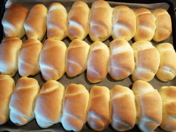 Τα αφήνουμε να φουσκώσουν για άλλα 30 λεπτά σε ζεστό μέρος. Ψήνουμε σε ένα ταψί με λαδόκολλα, σε προθερμασμένο φούρνο, στους 170 βαθμούς Κελσίου, στις αντιστάσεις και αέρα για 15 λεπτά.