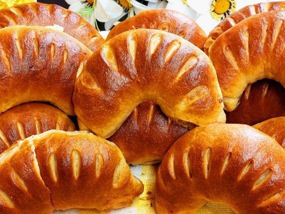 Μεταφέρουμε τη ζύμη στον πάγκο μας και ζυμώνουμε λίγο. Χωρίζουμε τη ζύμη σε κομμάτια των 80 με 120 γραμμαρίων το καθένα. Ανοίγουμε τα ζυμαράκια με τα χέρια μας σε κυκλικό σχήμα. Στην μία άκρη της ζύμης προσθέτουμε τη γέμισή μας, είτε αλμυρή είτε γλυκιά και στην άλλη άκρη χαράζουμε κάθετες γραμμές στη ζύμη.