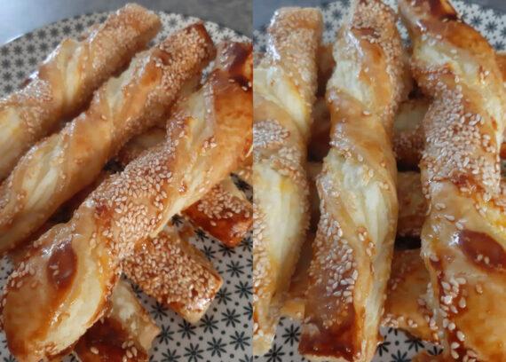Παίρνουμε την ζύμη μας, την ανοίγουμε με τον πλάστη σε ένα τετράγωνο φύλλο και το λαδώνουμε με το λιωμένο βούτυρο για το άλειμμα. Αλείφουμε όλη την επιφάνεια του φύλλου με τυρί κρέμα τύπου Φιλαδέλφεια. Κόβουμε σε λωρίδες και την κάθε λωρίδα την διπλώνουμε στην μέση και στην συνέχεια την στρίβουμε σαν κοτσίδα.