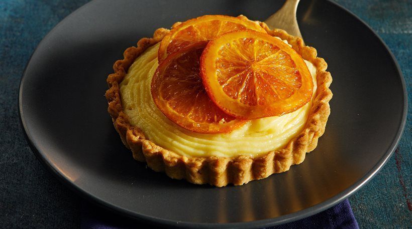 Καλύπτετε την επιφάνεια της τάρτας με τις ροδέλες πορτοκαλιού ώστε η κάθε φέτα να καλύπτει το μισό της άλλης.