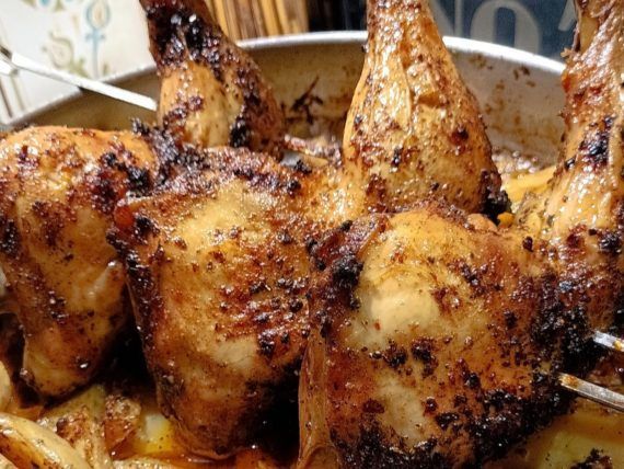 Δείτε παρακάτω την εκτέλεση για τα ξεροψημένα μπούτια κοτόπουλο σαν σούβλας στο φούρνο με πατάτες: