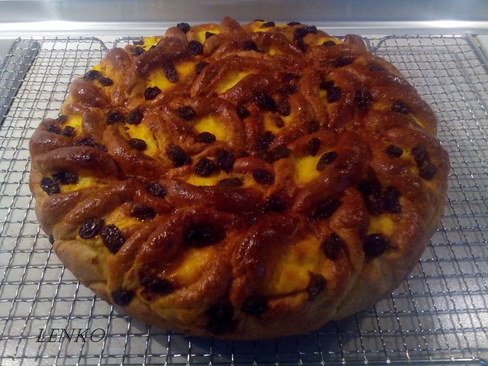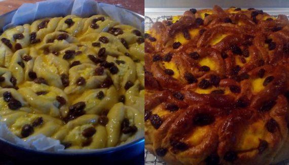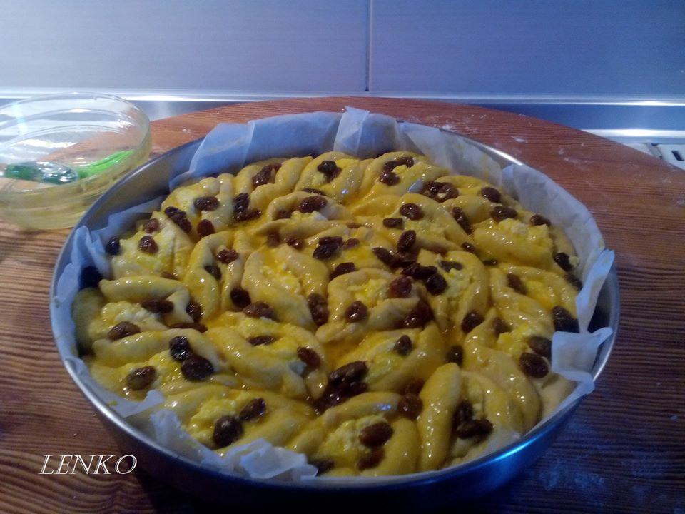 Σε μια λεκανίτσα ρίχνουμε το γάλα, τη ζάχαρη και τη μάγια. Ανακατεύουμε με τη σπάτουλα και προσθέτουμε το βούτυρο (λιωμένο),τα αυγά (ελαφρώς χτυπημένα) και το αλάτι. Ανακατεύουμε καλά να ομογενοποιηθούν τα υλικά. Προσθέτουμε σταδιακά το αλεύρι μέχρι να πετύχουμε μια ζύμη εύπλαστη και να μην κολλάει στα χέρια μας. Αφήνουμε τη ζύμη μας να φουσκώσει. Χωρίζουμε τη ζύμη σε 23 ίσα μέρη και πλάθουμε τα μπαλάκια μας. Ανοίγουμε το κάθε μπαλάκι και προσθέτουμε λίγη γέμιση. Κλείνουμε τις άκρες (να σχηματιστούν βαρκούλες) και τις βάζουμε στο ταψί όπου έχουμε στρώσει λαδόκολλα. Αφήνουμε την πίτα να φουσκώσει. Ρίχνουμε τις σταφίδες και αλείφουμε την πίτα με αυγό. Ψήνουμε στους 180 βαθμούς για 30-35 λεπτά.