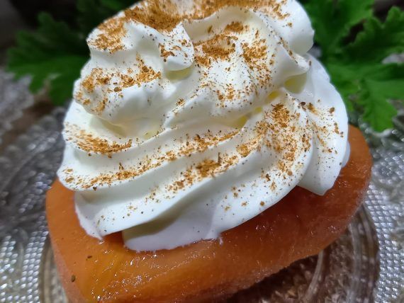 Κυδώνι ψητό στον φούρνο. Κυδώνι ψητό στον φούρνο με κονιάκ και γαρνιρισμένο με σαντιγί και κανέλα για επιδόρπιο.