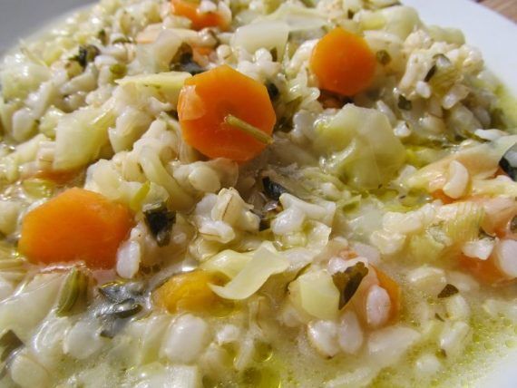 Βράζουμε το ρύζι και το σουρώνουμε πέντε λεπτά πρίν να είναι έτοιμο,να κρατάει δηλαδή.Κόβουμε σε λεπτές φετούλες τα καρότα και τα κρεμμυδάκια και ψιλοκόβουμε το σέλινο και το λάχανο.Σοτάρουμε σε λίγο λαδάκι τα λαχανικά μας,μόλις αρχίσουν να μαλακώνουν,ρίχνουμε το χυμό λεμονιού,το ρύζι,λίγο λάδι και ζεστό νερό ή ζωμό λαχανικών,τόσο ώστε να τα καλύπτει καλά.Χαμηλώνουμε πολύ τη φωτιά και αφήνουμε να σιγοβράσουν, με κλειστό καπάκι, μέχρι να είναι όλα μαλακά.Θέλουμε να μείνει λίγο ζουμάκι στην κατσαρόλα για να χυλώσει το φαγάκι,γι αυτό αν δείτε ότι δεν έχει το φαγητό υγρά και δεν είναι ακόμα έτοιμο,προσθέστε λίγο ζεστό νεράκι.Μόλις είναι έτοιμο ρίχνουμε λίγο φρέσκο λαδάκι.Απολαμβάνουμε ζεστό,αλλά και χλιαρό,μαζί με τυράκι!