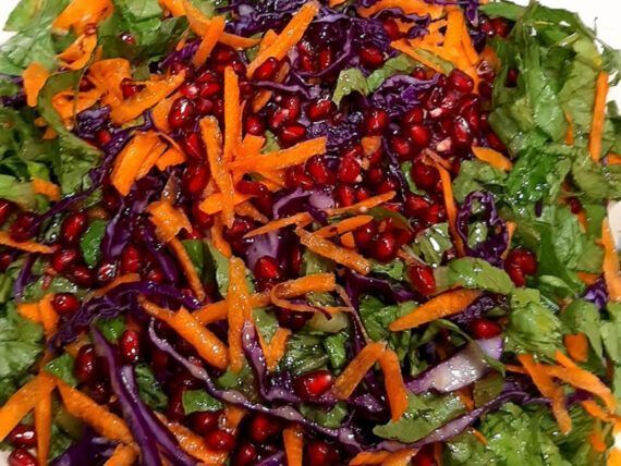 Χοντροκόβουμε το μαρούλι και το μοβ λάχανο και το ανακατεύουμε. Προσθέτουμε το τριμμένο καρότο, το οποίο το έχουμε τρίψει στο χοντρό του τρίφτη. Βάζουμε το ρόδι, το ελαιόλαδο, χυμό λεμονιού και λίγο αλάτι και ανακατεύουμε.
